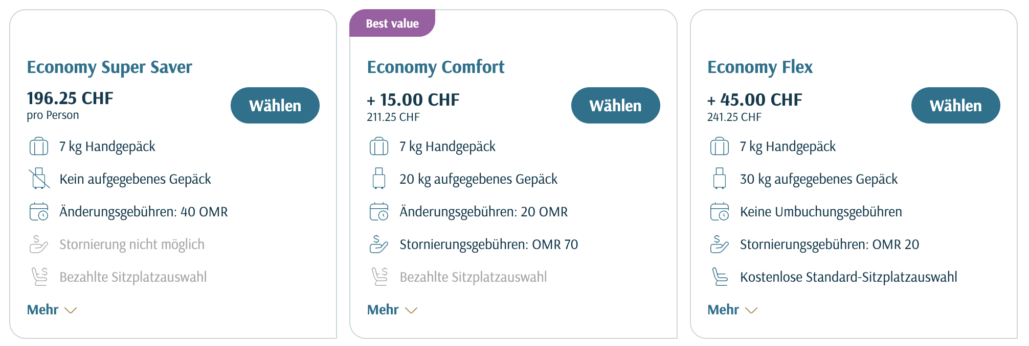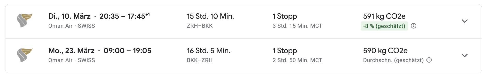 Ahoi, aktuell gibt's richtig preiswerte FlĂŒge nach Bangkok mit der guten Oman Air. Flugzeiten sind auch sehr in Ordnung, Check-In-GepĂ€ck kostet nur 15 Franken pro Richtung extra.