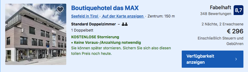 wenn ihr an Urlaub denkt, seht ihr keinen Sandstrand, sondern Wanderwege? Dann ist dieser Deal vielleicht genau das richtige für euch! Denn ÖSTERREICH ist endlich wieder bereisbar!! Das 4° Boutiquehotel das MAX liegt in Seefeld in Tirol und ist damit ideal gelegen für Ausflüge zu Fuß oder mit dem Rad. Zudem ist das Hotel wirklich cool eingerichtet und das Angebot ein echter Kracher!