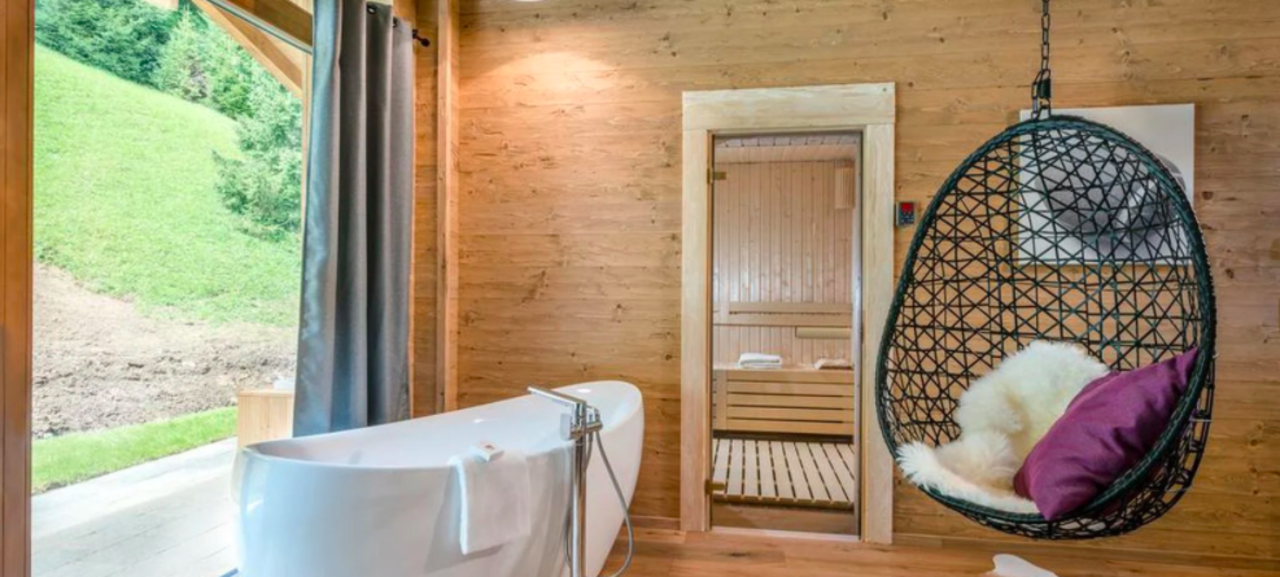 Private finnische Sauna im Chalet & Außenbadewanne auf der Terrasse!!