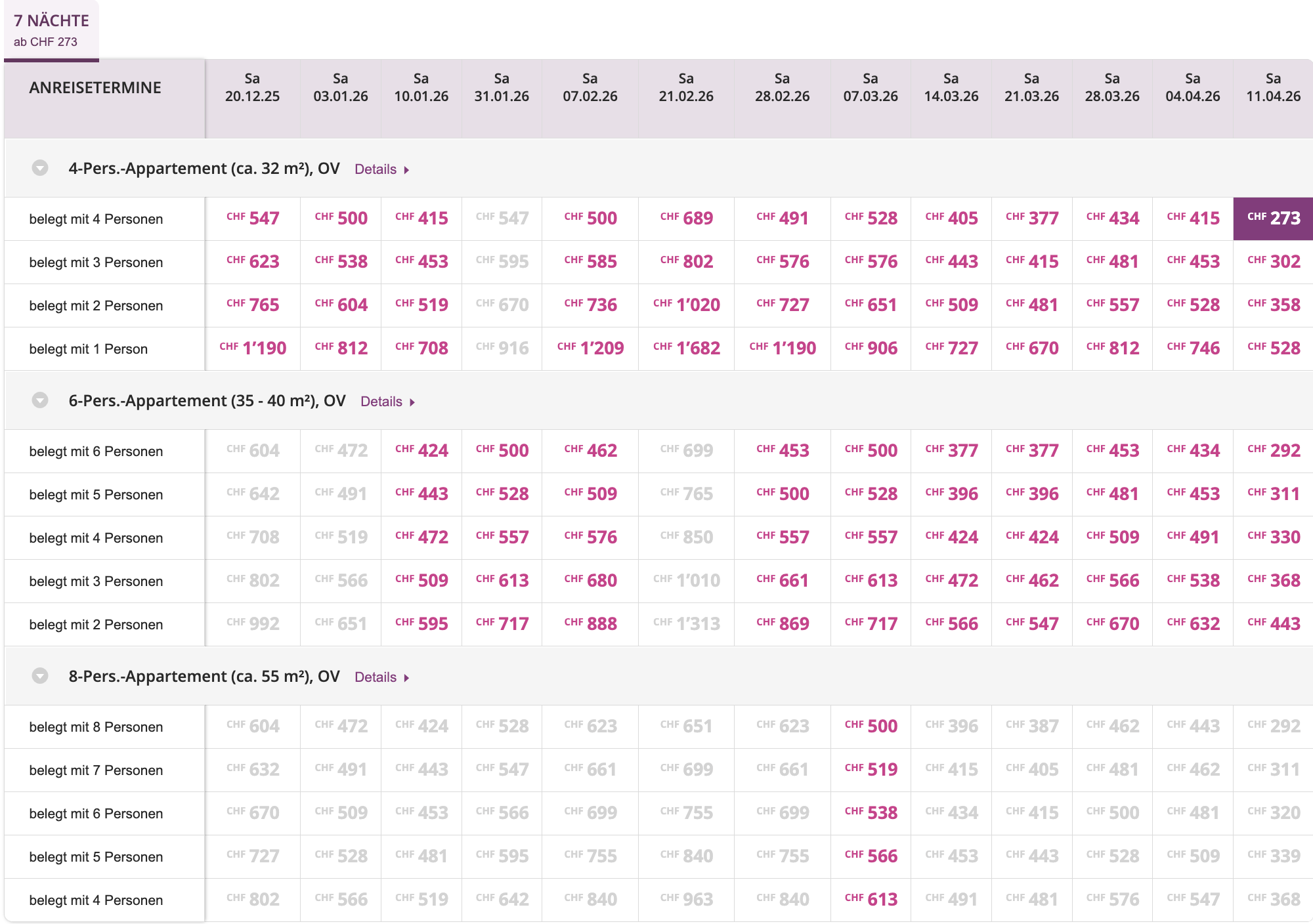 Getrennt gebucht: 7 Nächte für CHF 112 p.P. + CHF 165 für 6-Tage-Skipass p.P. = CHF 277 p.P.