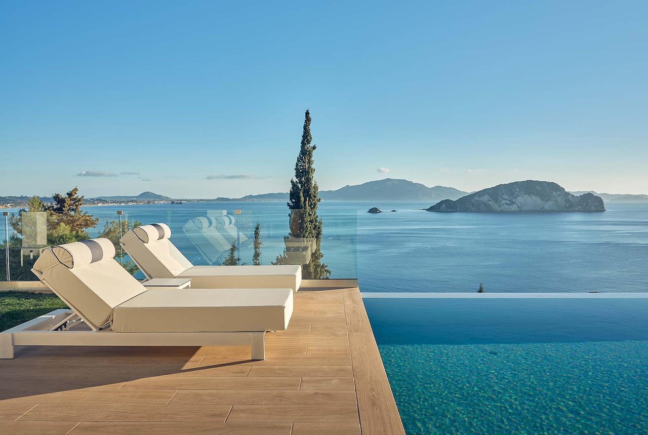 Sie steht auf der griechischen Insel Zakynthos und wurde erst 2019 gebaut. Durch die Verglasung könnt ihr den unglaublichen Blick aufs Meer, auf die Laganas-Bucht und die Halbinsel Vasilikos geniessen. Reicht euch nicht? Wie wäre es dann mit dem Ausblick vom Infinity Pool aus? Ausserdem ist ein Whirlpool mit von der Partie.