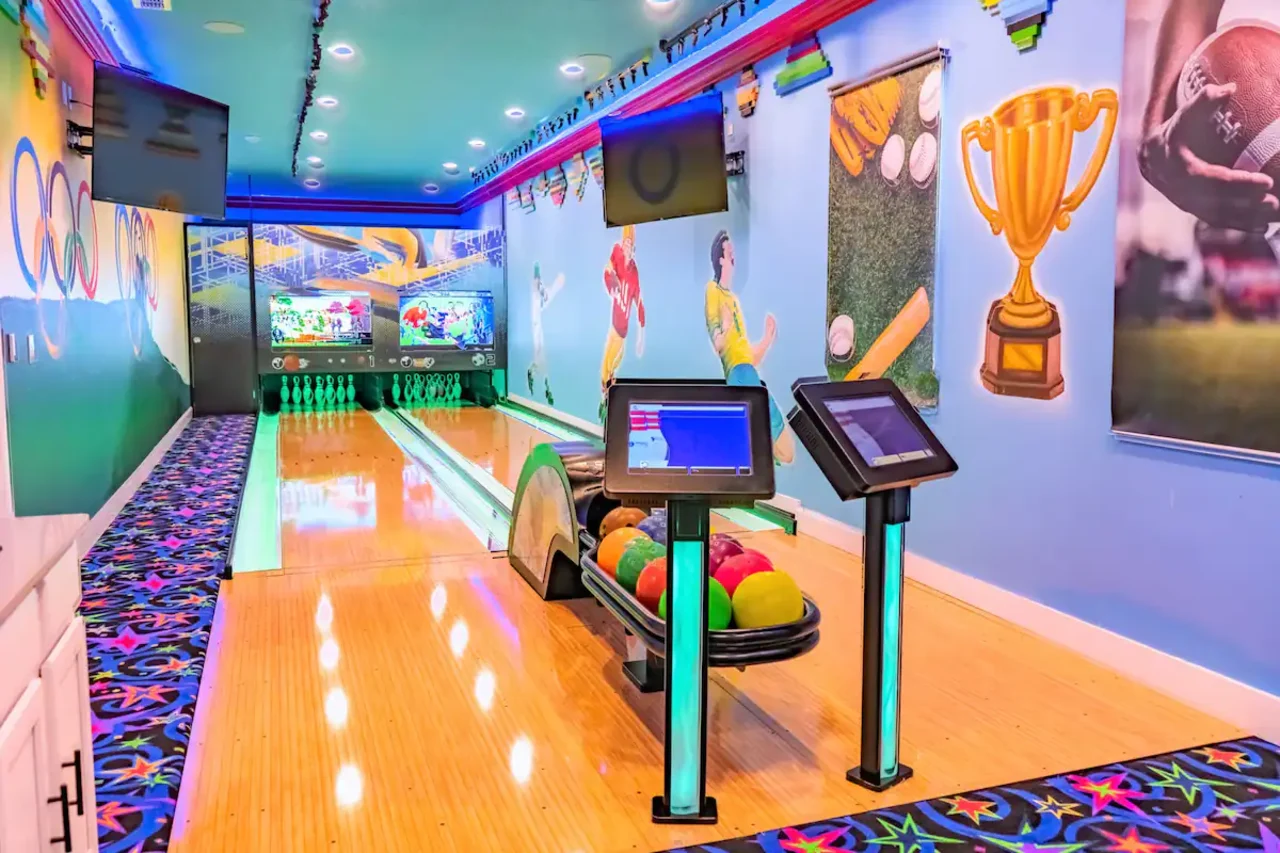 Jetzt kommen aber die Highlights: Ihr habt hier eure eigene zweispurige Bowlingbahn auf der ihr euch unter Beweis stellen dĂŒrft! Ausserdem gibt es eine LED-TV-Wand im Wohnzimmer sowie einen 4K 200-Zoll Projektorfernseher fĂŒr euer privates Kino-Erlebnis! đż